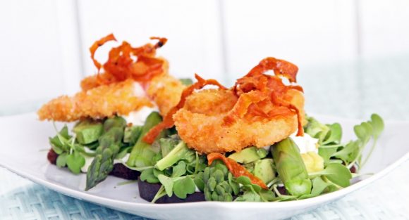 Tempurafriteerattuja jättikatkarapuja, parsaa ja avokadoa saaristolaisleivän päällä (4 hlölle)
