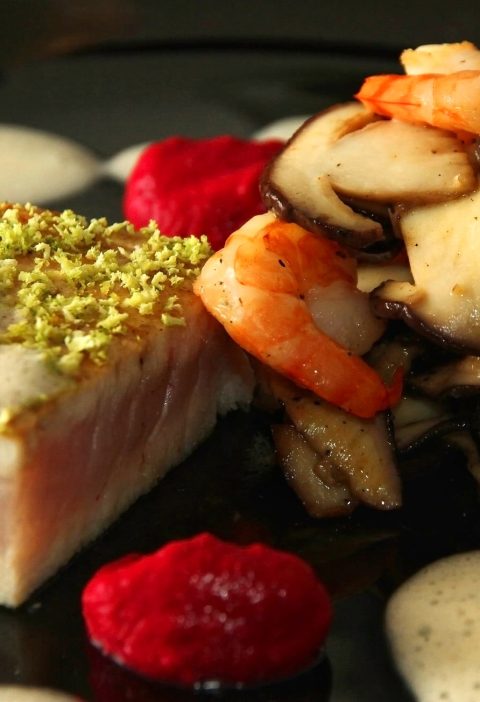 Halkaise vaniljatanko ja ota talteen veitsen tylpällä puolella vaniljansiemenet. Pese lime huolellisesti, raasta sen kuori ja lisää se vaniljan siementen ja oliiviöljyn kanssa kulhoon. Sekoita ja lisää kampasimpukat ja jättikatkaravunpyrstöt. Anna marinoitua 30 minuuttia. Ota simpukat ja ravunpyrstöt marinadista ja lisää niiden pinnalle hieman Maldon-suolaa. Kampasimpukat paistetaan suhteellisen kuumalla kuparipannulla. Paistoaika n. 45 sekuntia / puoli. Käytä paistoöljynä marinadia. Kuparipaistinpannun etuna on, että se saadaan tarpeeksi kuumaksi.