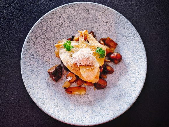 Kokoa annos laittamalla pohjalle paahdettuja maa-artisokkia, sipuleita ja herkkusieniä. Nostele muutama ahvenfilee kasvisten päälle, Viimeistele kaprisvoilla ja raastetulla piparjuurella.