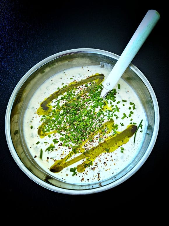 Leikkaa ruohosipulinvarret pieneksi silpuksi. Purista sitruunan mehu. Kaada kermaviilikastikkeen aineet (oliiviöljyä lukuun ottamatta) kulhoon ja sekoita hyvin. Jätä hieman ruohosipulisilppua viimeistelyyn. Anna kastikkeen maustua jääkaapissa puoli tuntia.