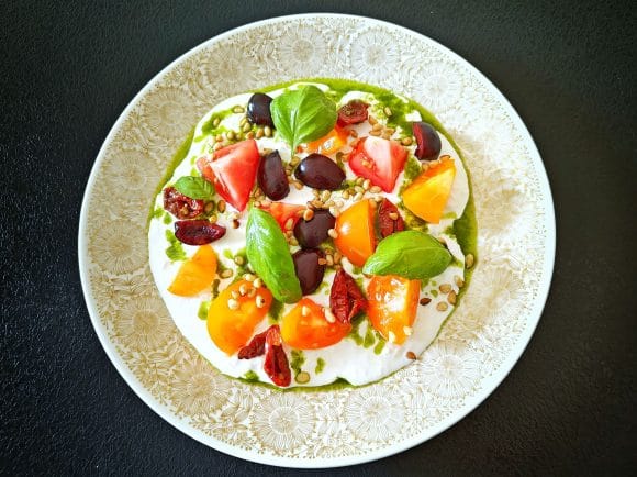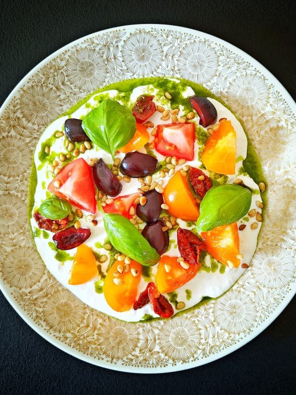 Kuvittele lautasella kesän hehkuva väripaletti: samettisen pehmeä burrata, makeat kirsikat, mehukkaat tuoreet tomaatit ja intensiivisen aromikkaat aurinkokuivatut tomaatit. Burratan kiinteän mozzarellakuoren alta paljastuu kermaisen täyteläinen sydän – stracciatellan ja hyytyneen kerman silkkinen sekoitus, joka sulaa suussa kuin unelma.