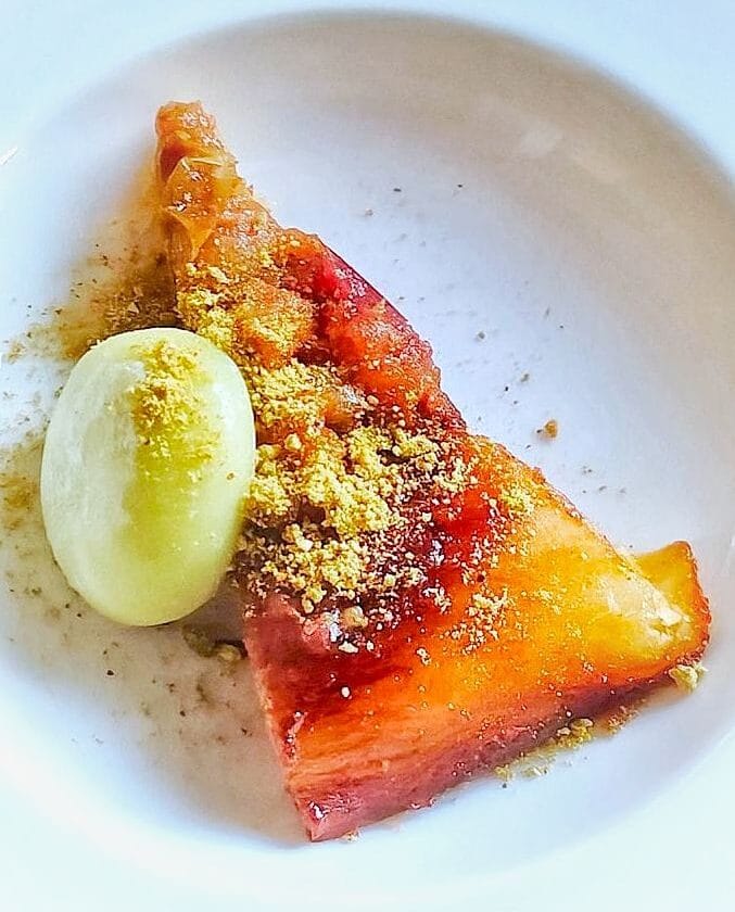 Tarte Tatin syntyi vahingossa, kun Tatinin toinen sisaruksista poltti vahingossa voi-sokeriseoksen pohjaan. Legenda oli syntynyt! Aromipajan versiossa keikauspiirakkaan lisätään pistaasipähkinämurua ja se nautitaan pistaasijäätelön kera.