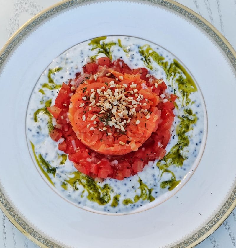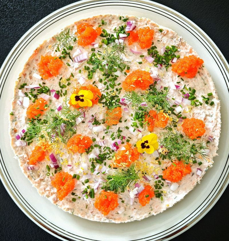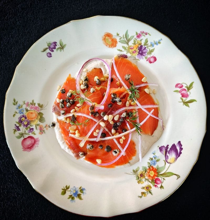 Kokeilin käyttää herkullista tonnatokastiketta kylmäsavulohen kera, ja makuyhdistelmä oli mitä mainioin. Kaiken kruunasi tilkassa öljyä friteeratut rapeat kaprikset. Annos viimeistellään punasipulilla ja paahdetuilla pinjasiemenillä.