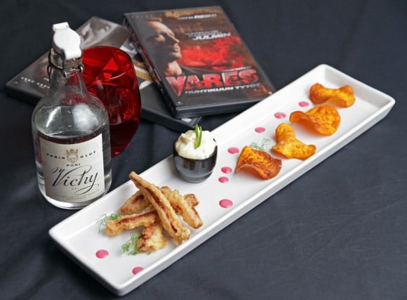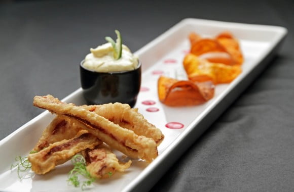 Tempurafriteerattua makkara, bataattisipsit ja inkivääri-sitruunaruohodippi