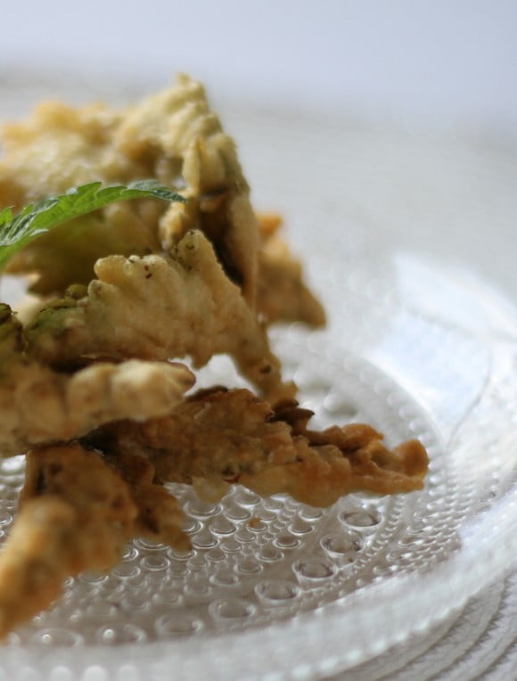 Huuhtele mustaherukanlatvat kylmän veden alla ja kuivaa ne. Kuumenna öljy kattilassa. Valmista japanilaistyylinen tempurataikina juuri ennen lehtien friteerausta. Erottele keltuaiset ja kaada jääkylmä vesi niiden päälle kulhoon. Veden pitää ehdottomasti olla jääkylmää. Voit kylmentää veden pakastimessa. Sekoita keltuaisten rakenne rikki, lisää jauhot ja sekoita tasaiseksi taikinaksi. Upota mustaherukanlehdet taikinaan ja friteeraa kullanruskeiksi. Nostele lehdet talouspaperin päälle ja ripottele sormisuolaa niiden päälle. Friteeratut mustaherukanlehdet ovat parhaimmillaan heti tarjoiltuna.