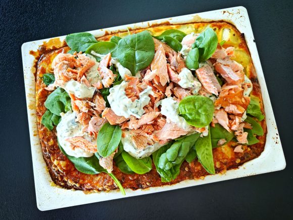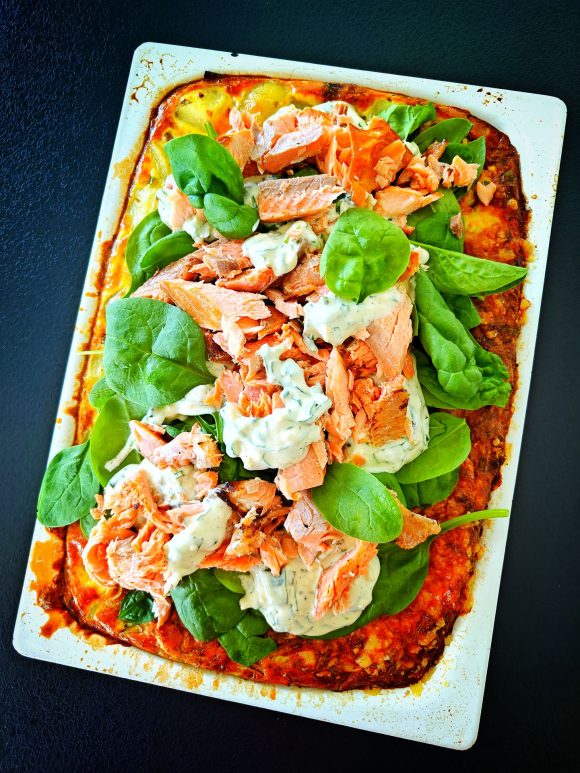 Viimeistele savulohi-frittata pinaatinlehdillä, savulohella ja sitrus-jogurttikastikkeella.