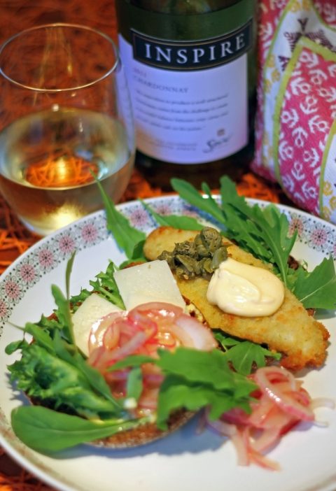 Leikkaa kananpojan fileepalat viipaleiksi. Kokoa leipäviipaleiden päälle rucolan versoja, sienisalaattia, kananpojan viipaleita ja sriracha-majoneesia.