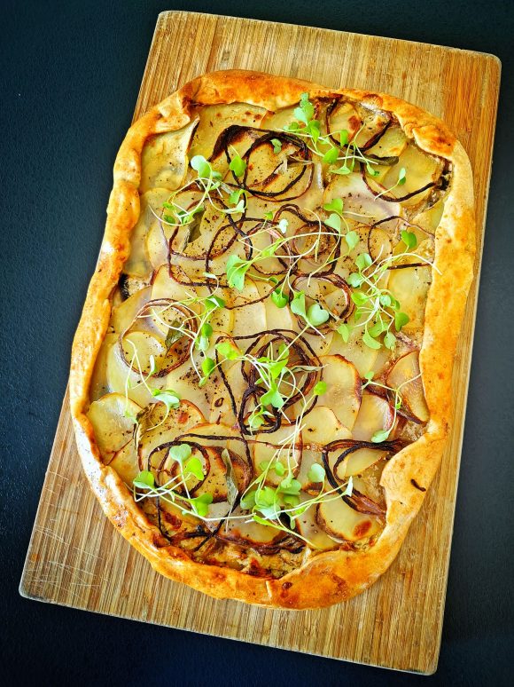 Galette on rustiikkinen ranskalainen avopiirakka. Aromipajan galette täytetään juustoisella jogurttikastikkeella, uusilla perunoilla, herkkusienillä ja punasipulilla. Galette sopii mainiosti juhlien pitopöytään. Mielestäni sen maku jopa paranee, jos sen valmistaa edellisenä päivänä ja lämmittää hieman ennen tarjoilua.