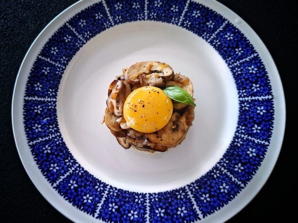 Paahda paahtoleipäviipaleet. Jos omistat stanssin (pyöreän muotin), voit leikata leipäviipaleet ympyrän muotoiseksi. Asettele lautaselle paahtoleipäviipale ja nostele lusikalla sieniä stanssin avulla leivän päälle. Viimeistele annos kananmunan keltuaisella ja ripauksella mustapippuria.