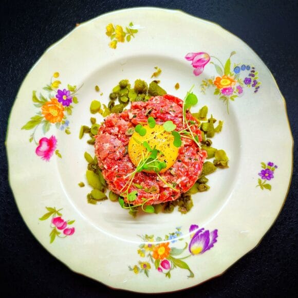 Muotoile lihasta pihvit lautasille ja nosta kananmunan keltuainen pihvin päälle sekä asettele suolakurkku- ja kapriskuutiot pihvin ympärille. Nauti leivän ja aioli-parmesaanimajoneesin kera!
