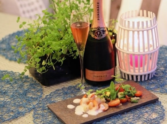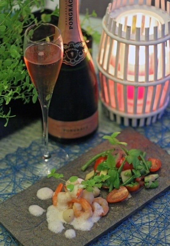 Perinteisellä pullokäymismenetelmällä (Méthode Champenoise) valmistettu kuohujuoma syventää annoksen makumaailmaa. Annokselle valittavasta kuohuviinistä tai samppanjasta tulisi löytyä tarpeeksi hapokkuutta ja sitruksellisia aromeita, jotta salaatin runsas hapokkuus ei dominoisi annosta liikaa.