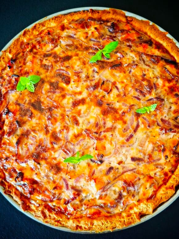 Mehevä cheddar-savulohi-sipulipiirakka (6-8 hlölle / iso piirakkavuoka)