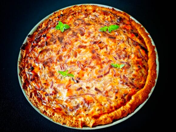 Mehevä savulohi-sipulipiirakka on syntisen hyvää