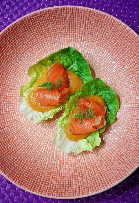 Muotoile leipäsiivut pyöreiksi muotin avulla, jonka halkaisija on noin kahdeksan senttimetriä. Nostele leipäviipaleille itämainen majoneesi sekä jättikatkaravunpyrstöt. Koristele korianterinlehdillä.