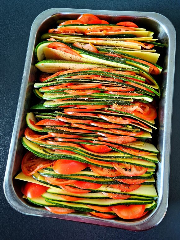 Pese kesäkurpitsat ja tomaatit hyvin. Leikkaa kesäkurpitsat ohuiksi viipaleiksi pituussunnassa veitsellä tai mandoliinilla. Viipaloi tomaatit ohuiksi viipaleiksi. Keitä isossa kattilassa vettä ja lisää siihen runsaasti suolaa. Keitä muutamaa lasagnelevyä kerrallaan 2 minuuttia ja nosta ne pois keittiöpyyhkeen päälle. Halkaise lasagnelevyt pituussuunnassa puoliksi. Toista sama muiden lasagnelevyjen kanssa. Voit alkaa koota samalla lasagnea. Asettele vuorotellen kesäkurpitsaa, tomaattia ja lasagnelevyjä pystysuunnassa isoon uunivuokaan. Mausta ripauksella suolaa ja mustapippuria.