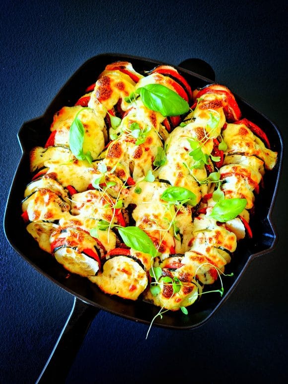 Kesäkurpitsasta, tomaatista ja sipulista syntyy värikäs ja aromikas paistos, jonka pinnan kruunaa täyteläinen, juustoinen kastike. Kasvikset asetellaan näyttävästi pystysuuntaan, jolloin paistos hurmaa jo ennen ensimmäistäkään suupalaa. Tämä herkku sopii yhtä hyvin kevyeksi pääruoaksi kuin maukkaaksi lisukkeeksi.