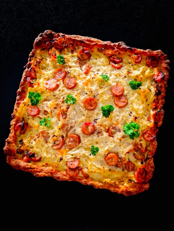 Juustoinen krakovanmakkara-hapankaalipiirakka (25cm x 25cm tai iso pyöreä piirakkavuoka)