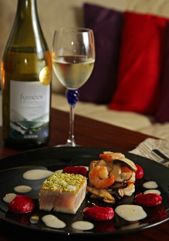 Lime-tonnikalaa, jättikatkarapuja, sieniä, punajuurta ja sherrykastiketta (4 henkilölle)