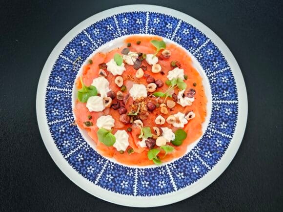 Carpaccio on italialaisen keittiön klassikko, jossa yksinkertaisuus ja eleganssi kohtaavat. Ohueksi leikattu, kypsentämätön kala tai liha saa seurakseen raikkaan öljypohjaisen kastikkeen, joka korostaa raaka-aineen hienovaraisia makuja. Aromipajan lohicarpaccio vie nautinnon vielä pidemmälle – annos kruunataan uunissa paahdetuilla hasselpähkinöillä ja täyteläisellä piparjuurikastikkeella, jotka tuovat kokonaisuuteen paahteista syvyyttä, sopivaa potkua ja ihastuttavaa rapeutta.
