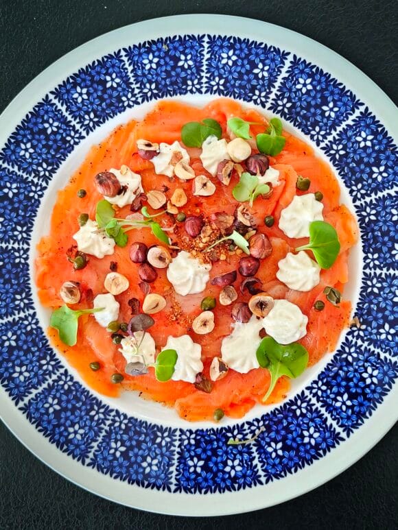 Lohicarpaccio, paahdettuja hasselpähkinöitä ja piparjuurikastiketta (4 hlölle)