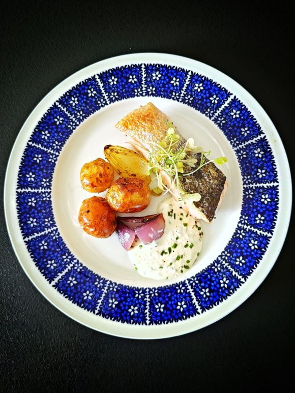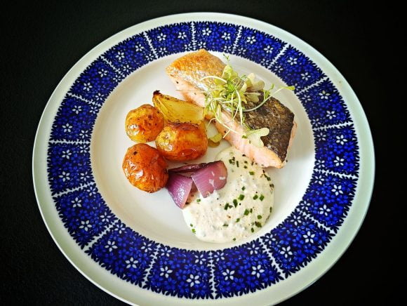Uudet perunat voi valmistaa myös uunissa (tai grillissä). Tällöin niistä tulee ihanan rapeita. Lisäksi kesäiseen kala-annokseen paahdetaan lohta ja sipuleita. Annos tarjoillaan herkullisen Aromipajan piparjuurella maustetun kermaviilikastikkeen kera.