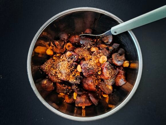 Halkaise herkkusienet veitsellä. Sekoita uunivuoassa sekaisin herkkusienet, soijakastike, balsamicokastike ja mustapippuri. Paahda sienniä uunissa (200°C) 20-30 minuuttia, kunnes herkkusienet ovat kullanruskeita.