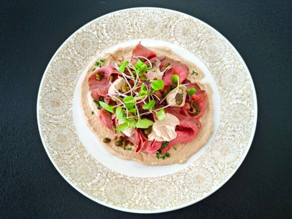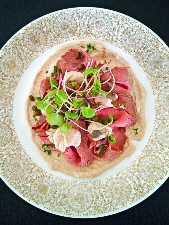 Nostele lautasten pohjalle tonnikalakastiketta ja levitä se tasaiseksi kerrokseksi. Asettele ohuet paahtopaistisiivut tonnaton päälle. Levitä paahtopaistin päälle lisää tonnikalakastiketta. Viimeistele annos kapriksilla ja salaatinversoilla