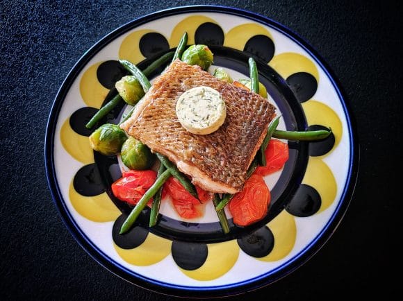 Voissa paistettu siika, paahdetut tomaatit, vihreät pavut ja ruusukaalit (4 hlölle)