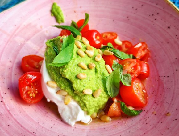 Todella herkullinen salaatti valmistuu käden käänteessä mehevistä kirsikkatomaateista, bufala mozzarellasta, hernepestosta ja paahdetuista pinjansiemenistä. Tätä herkkua kannattaa ehdottomasti kokeilla heti tänään!