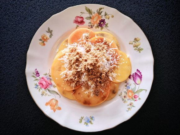 Pese persimon-hedelmät hyvin lämpimän veden alla ja kuivaa ne. Leikkaa mandoliinilla hedelmästä ohuita siivuja. Voit käyttää myös terävää veistä leikkaamiseen. Murenna piparkakut muruksi käsin tai morttelilla. Raasta parmesaani hienoksi raasteeksi. Suosittelen käyttämään microplane-raastinta.