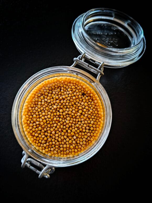 Laita pikkelöidyt sinapinsiemenet puhtaaseen lasipurkkiin ja sulje kansi. Anna purkin jäätyä ja siirrä se jääkaappiin. Anna sinapinsiementen tekeytyä vähintään tunnin verran tai seuraavaan päivään.