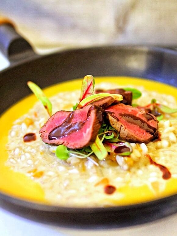 Paistettu poronfilee, kurpitsarisotto ja riista-karpalokastike (4 hlölle)
