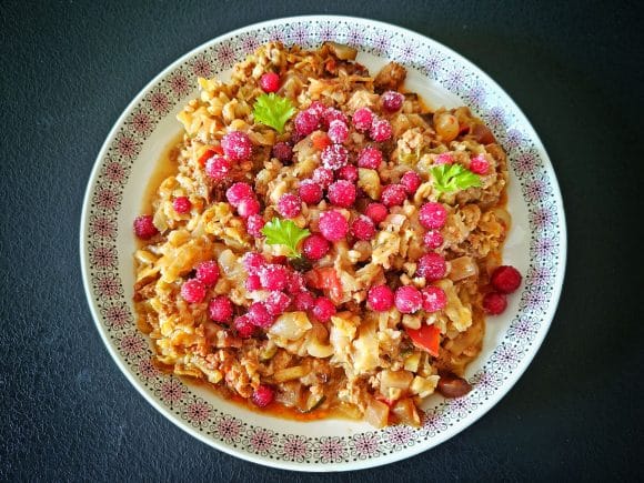 Tarjoa kaalilaatikko sokeroitujen puolukoiden tai karpaloiden kera.