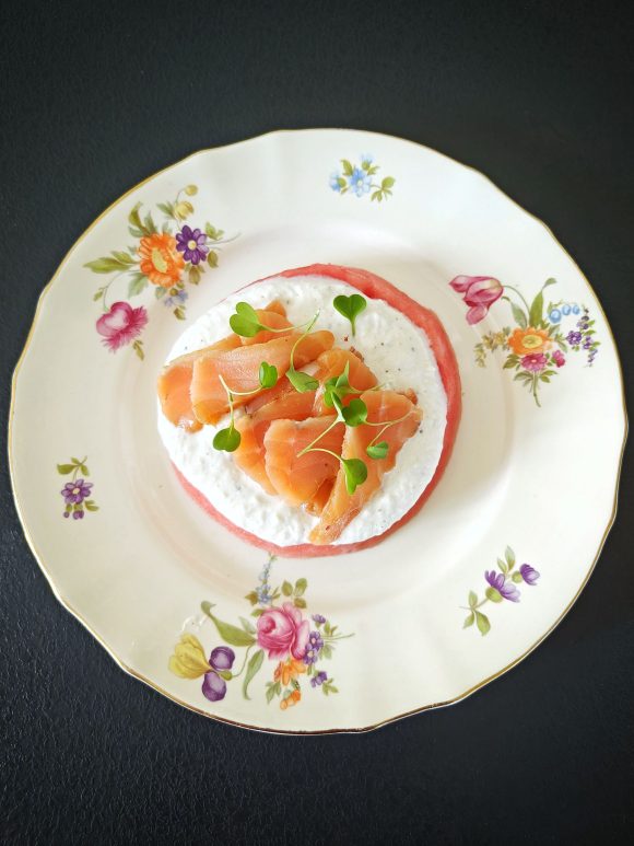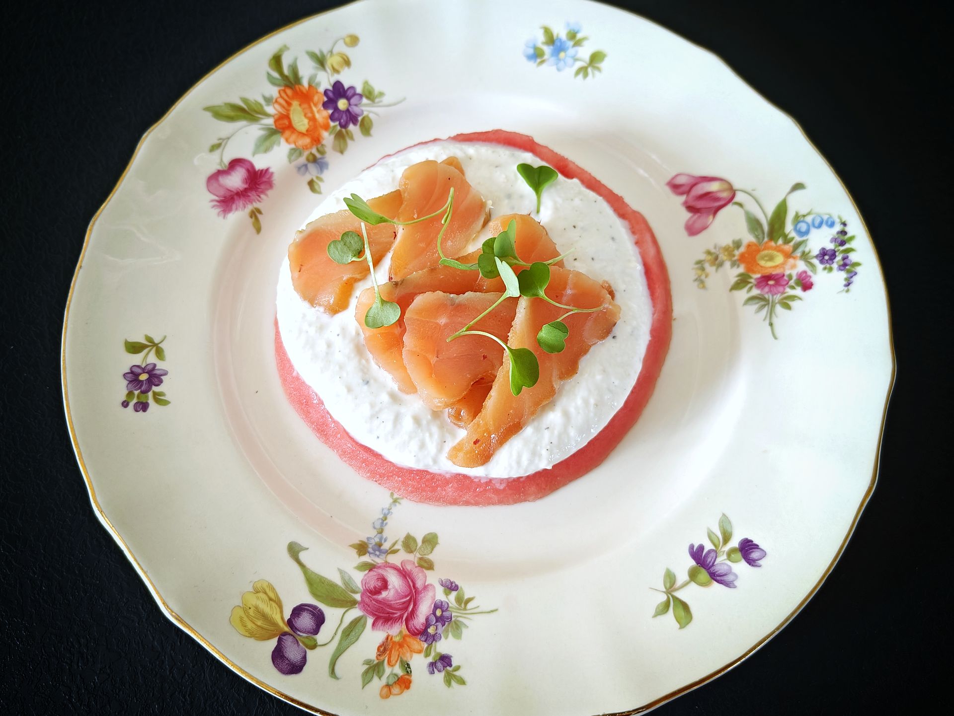 Kesällä on kiva syödä kevyemmin. Makea ja raikas vesimeloni on oiva makupari graavilohen suolaisuudelle. Reseptissä vesimeloni leikataan kiekoiksi annoksen pohjalle ja sen päälle lusikoidaan sitruunaista jogurttikastiketta. Annos viimeistellään graavilohisiivuilla.