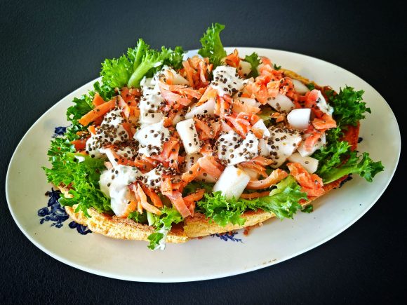 Kun yhdistät munakkaan ja salaatin, saat ruokaisan ja herkullisen annoksen. Paista munakas ”hollantilaisen pannukakun” tyyliin valurautapannussa. Tällöin munakkaasta tulee kuppimainen. Munakas täytetään salaatilla, hunajamelonilla, kylmäsavulohella ja raikkaalla jogurtti-piparjuurikastikkeella.
