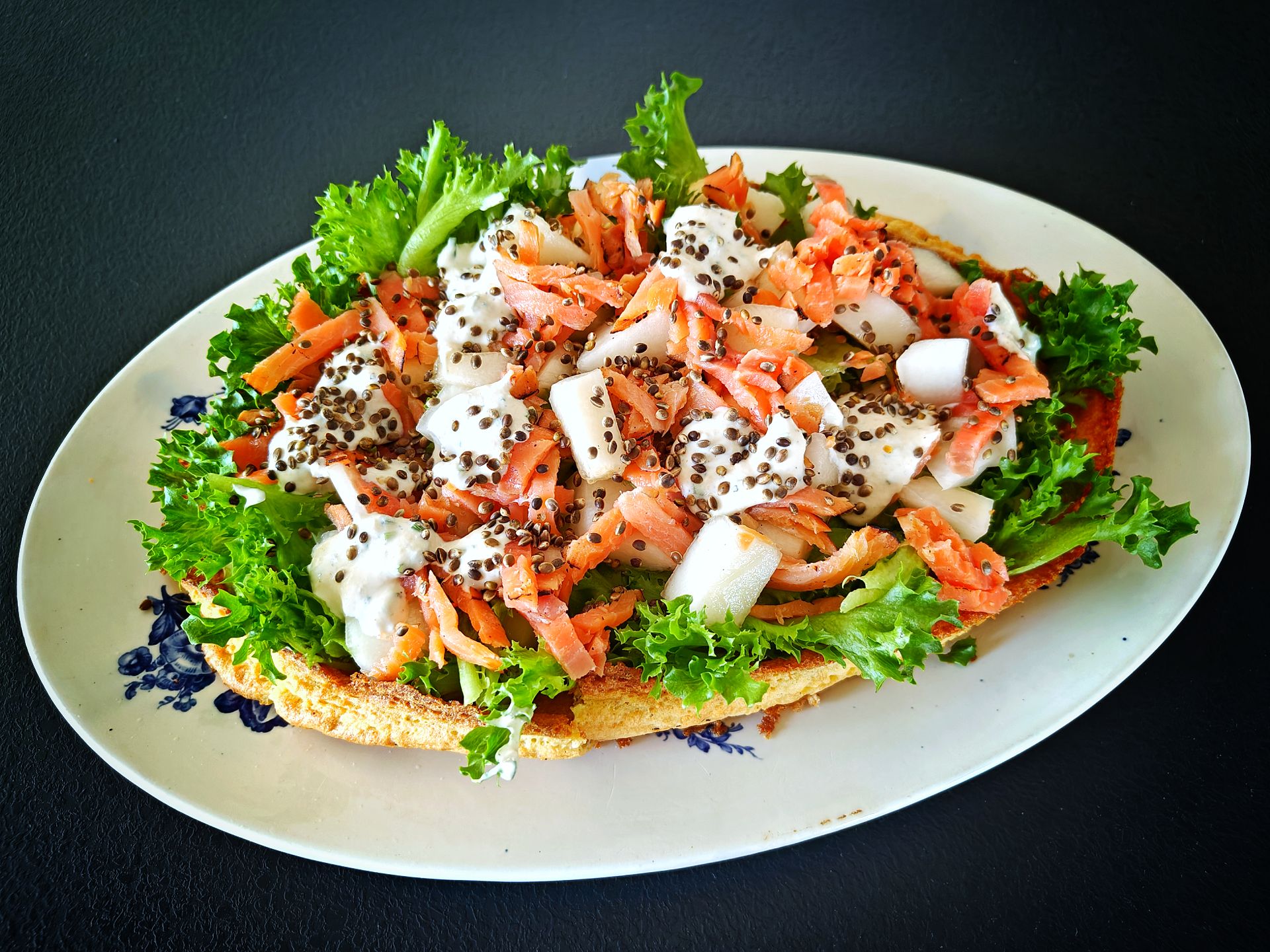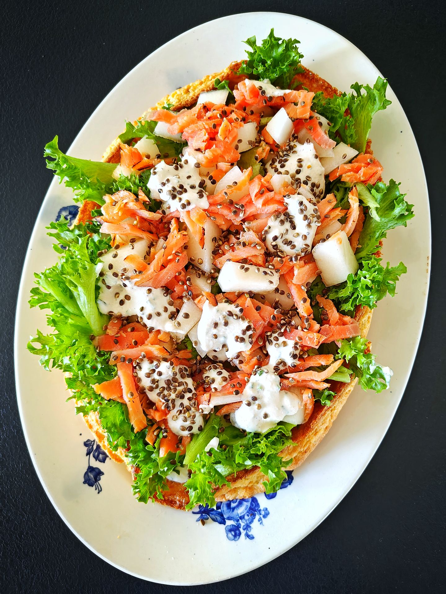 Pese salaatti ja kuivaa se. Poista hunajamelonista siemenet ja kuori se. Leikkaa meloni sopivan kokoisiksi suupaloiksi veitsellä. Kokoa munakas nostelemalla sen päälle jogurtti-piparjuurikastiketta, revittyä salaattia, hunajamelonia ja kylmäsavulohta. Lusikoi vielä munakassalaatin päälle jogurttikastiketta. Viimeistele salaatti paahdetuilla hampunsiemenillä.