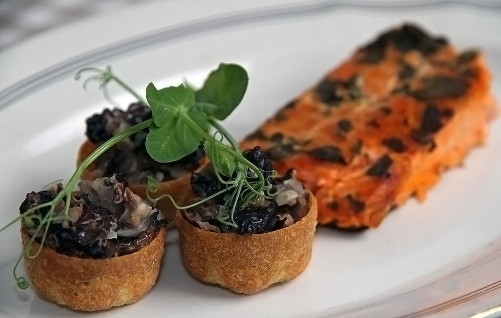 Savustettu lohi ja rapeat korvasienikupit