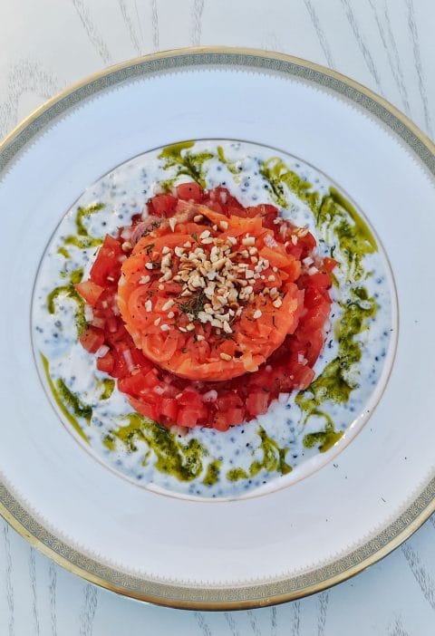 Tomaattitartar, kylmäsavulohi ja jogurttikastike