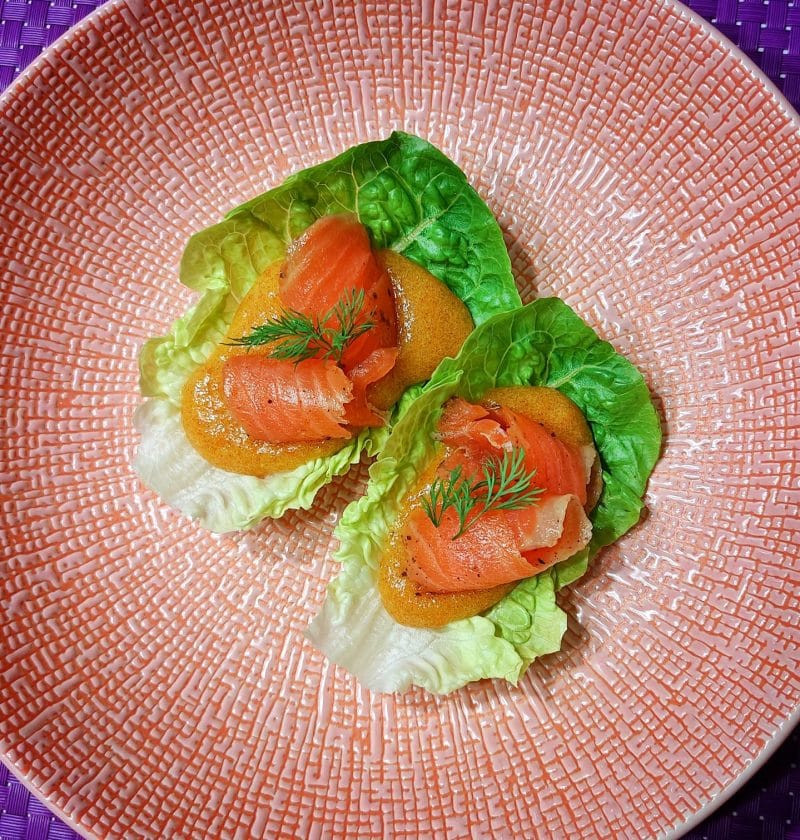 Sydänsalaatinlehden päälle on helppo koota maistuva alkupalatapas. Persimoneista saat sauvasekoittimella nopeasti herkullista pyreetä. Graavilohiviipaleen suolaisuus sopii loistavasti makean sharonhedelmän ja salaatin seuraan.