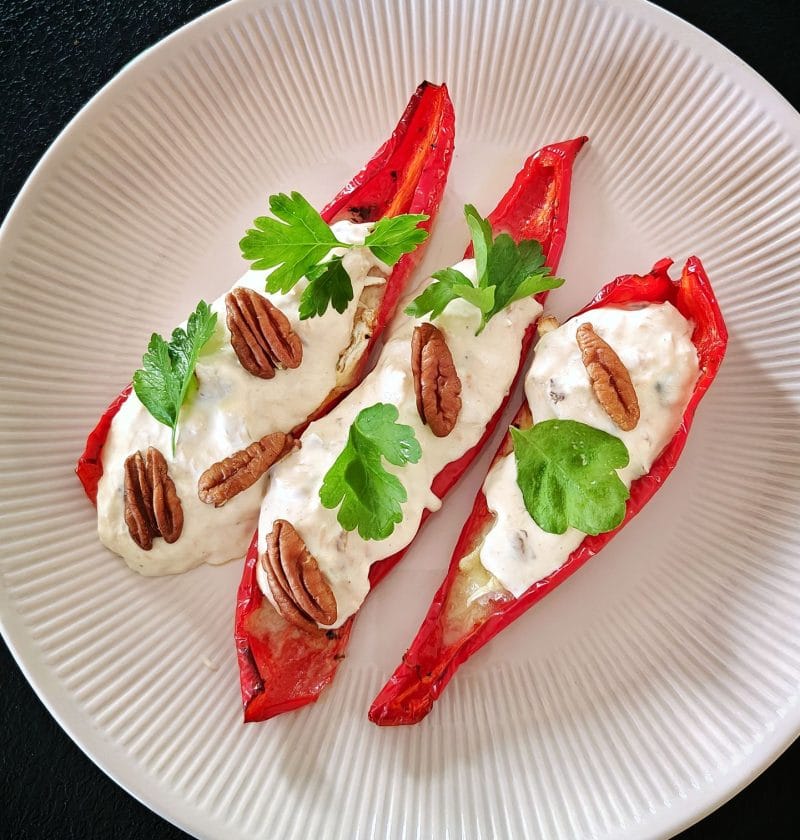 Savulohitahna sopii loistavasti uunissa paahdettujen suippopaprikoiden täytteeksi. Aikaa tämän alku- tai välipalan tekemiseen kuluu kokonaisuudessaan puoli tuntia. Annos viimeistellään maistuvilla pekaanipähkinöillä.