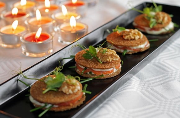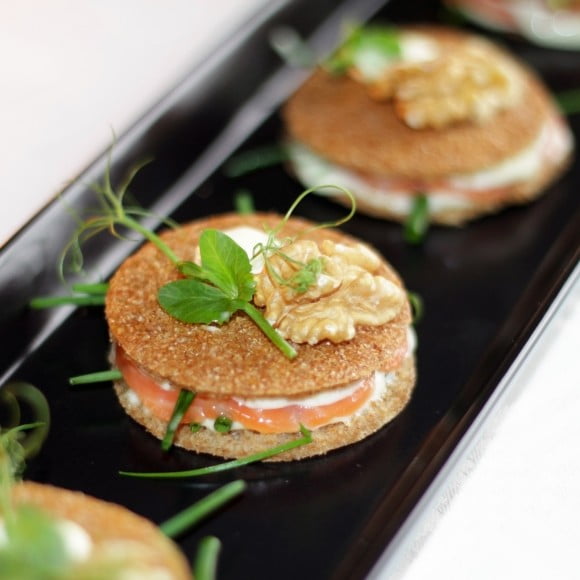 Tapaspöydän ehdoton makupala on kaunis lohihampurilainen, jossa yhdistyvät suomalainen ja itämainen makumaailma.