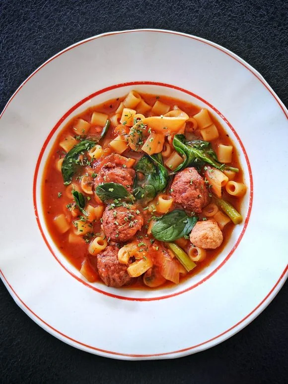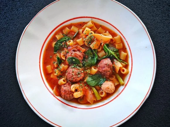 Tomaattipohjainen italialainen lihapullakeitto on koko perheen suosikkiruokaa. Lihapullat kannattaa valmistaa itse, mutta kiireinen kokki voi käyttää myös valmiita lihapullia. Tuore pinaatti tuo keittoon väriä ja makua. Pinaatti lisätään keittoon aivan lopuksi.