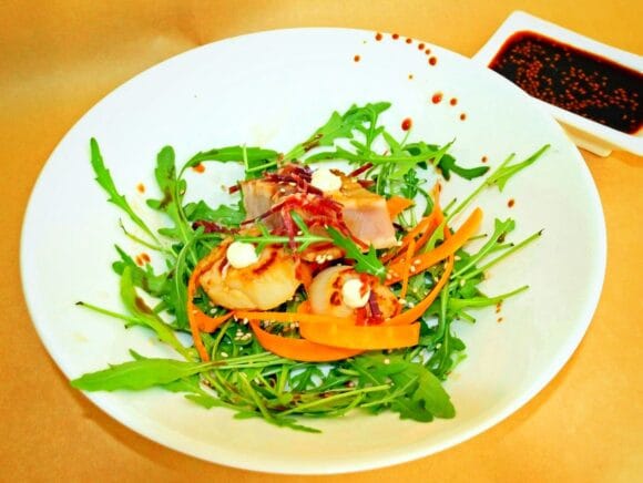 Hienostunut ja herkullinen annos syntyy inkiväärillä, paahdetuilla seesaminsiemenillä ja ruokosokerilla maustetussa soijakastikkeessa marinoidusta tuoreesta tonnikalasta, kampasimpukoista, wasabimajoneesista, ilmakuivatusta kinkusta ja rucolasta.