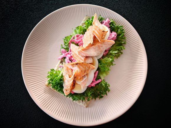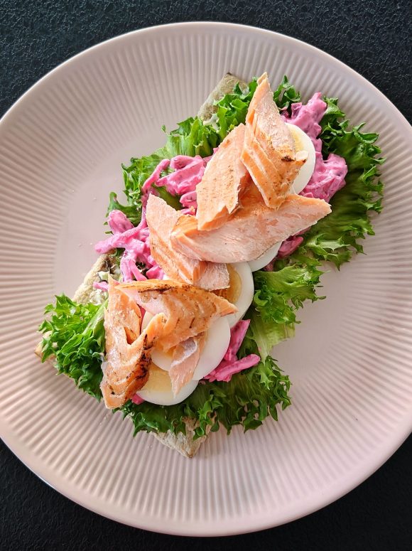 Kokoa rieskat voitelemalla ja asettelemalla niiden päälle salaattia, punajuurisalaattia, kananmunia ja savulohta.
