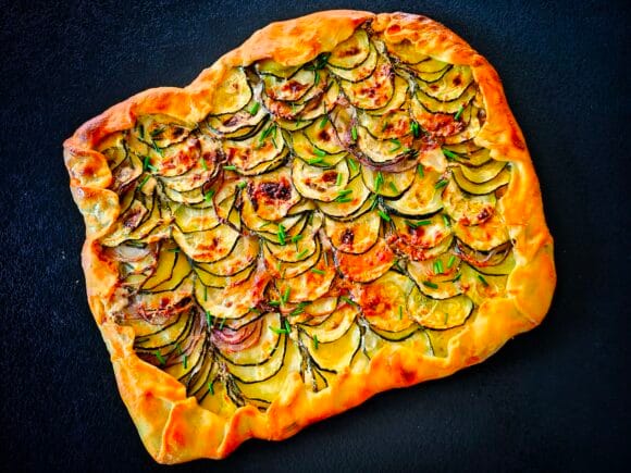 Rustiikkinen Välimeren feta-kesäkurpitsapiirakka on mehevää