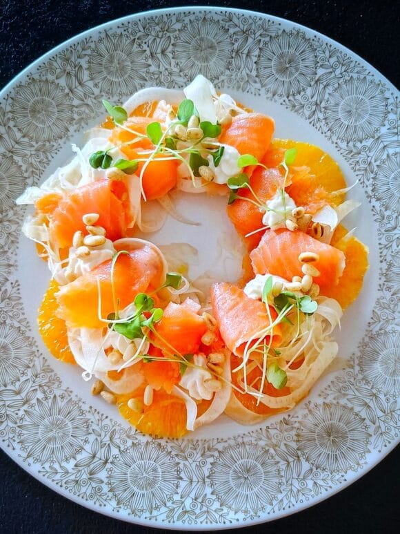 Veriappelsiini, graavilohi, fenkoli ja piparjuurikreemi (4 hlölle)